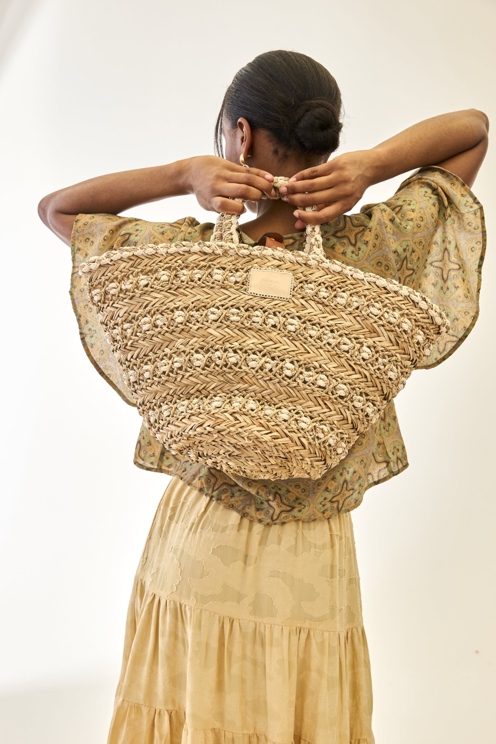 Bolso shopper de rafia y flecos. Asa de hombro de piel natural. Forro interior. Cierre con cremallera.