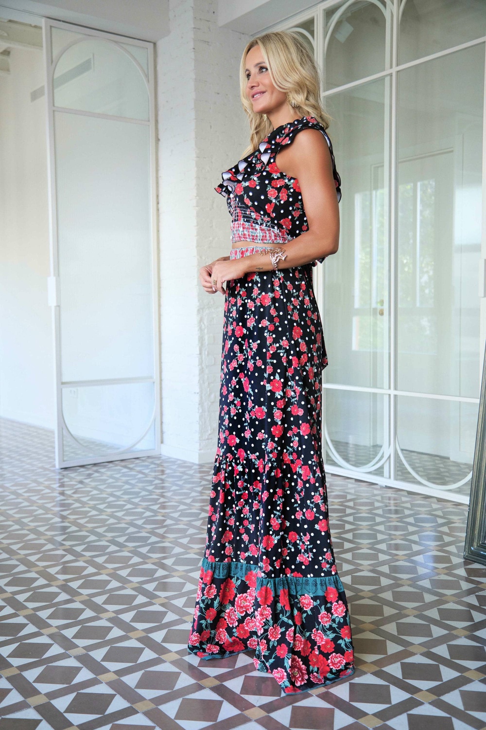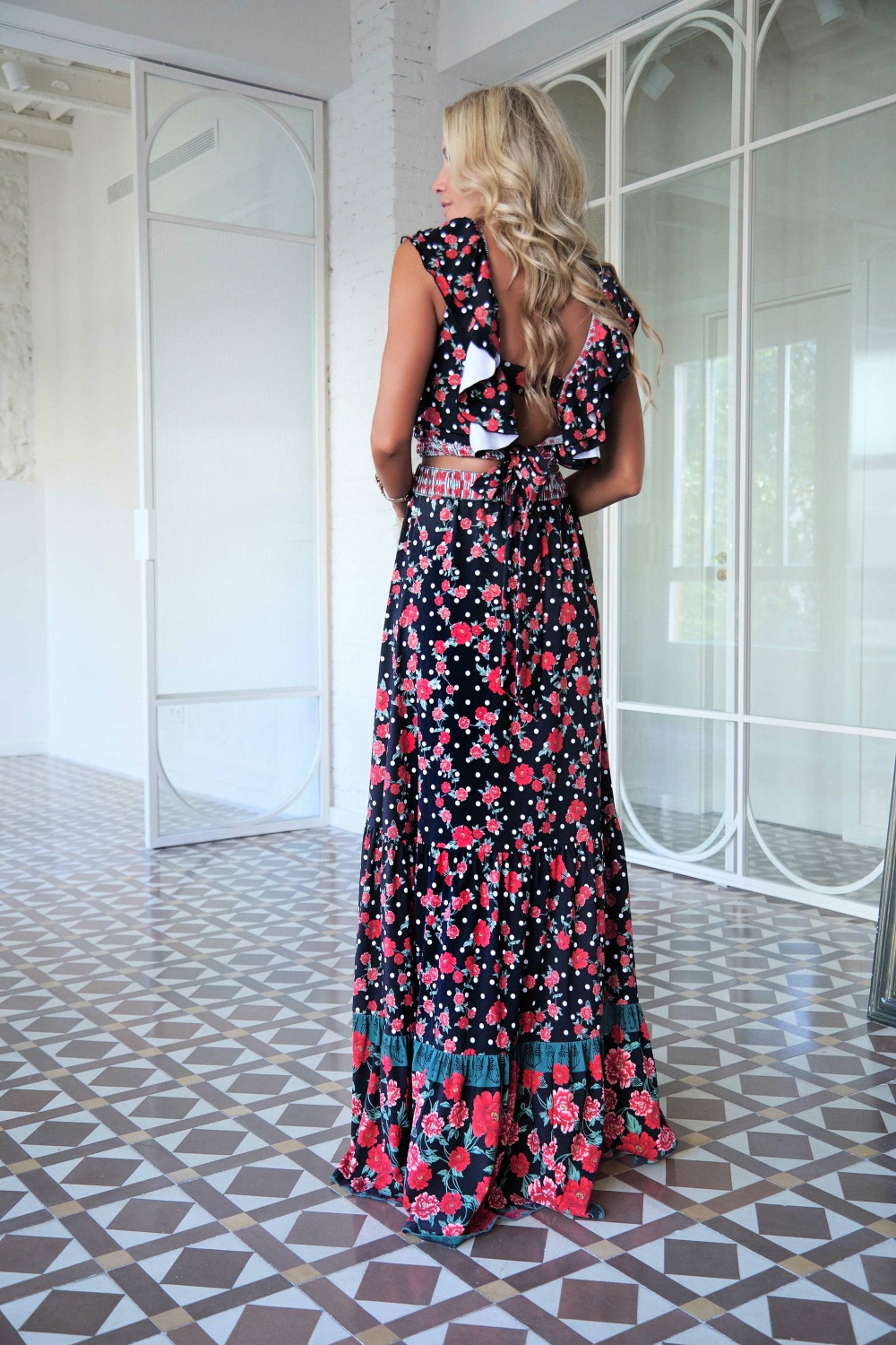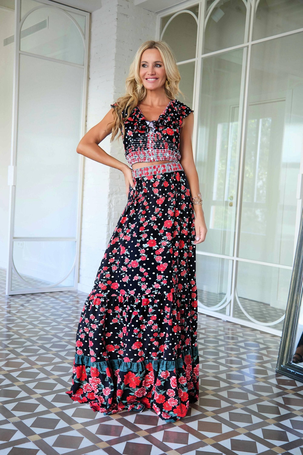Top negro corto, de lunares con estampados a flores rojas y verdes. El escote de pico y es desmangado, y el lleva dos volantes que van desde el pecho y caen sobre las hombros. La parte del abdomen es toda de nido de abeja, por lo que se queda entallado al cuerpo. La espalda es descubierta y lleva una banda de quita y pon, con clips, mas o menos a la mitad de la espalda. En la cintura, lleva una cinta para anudar en la parte de atrás.