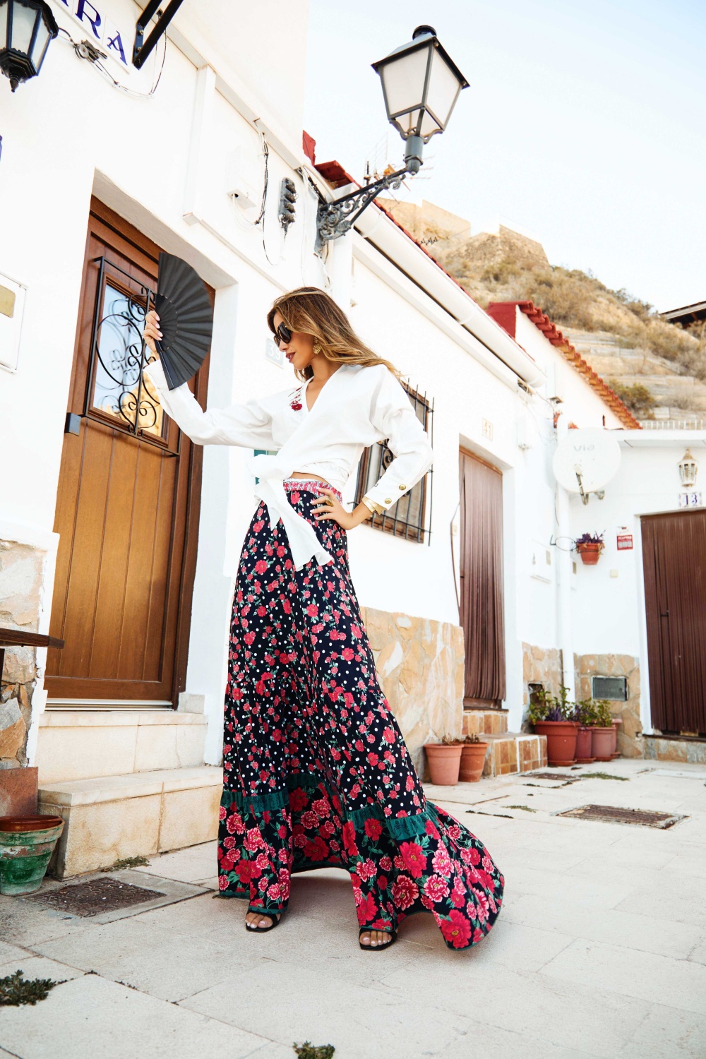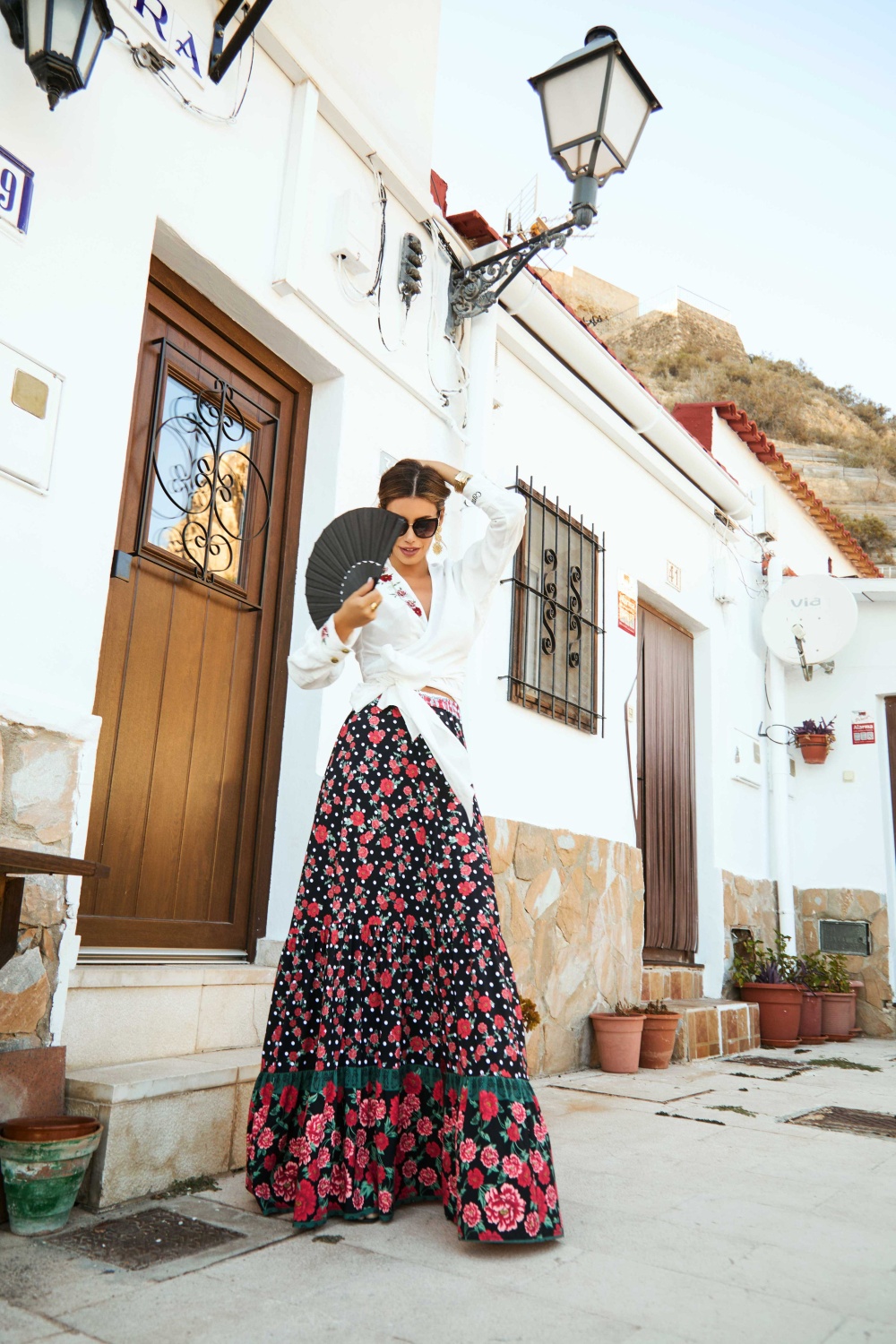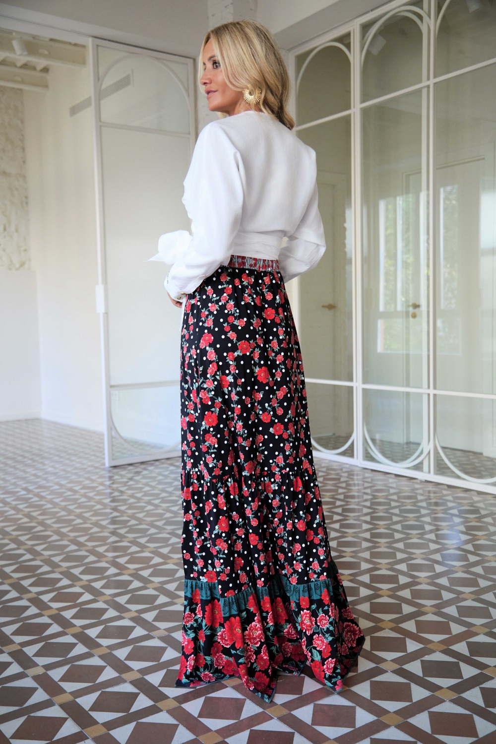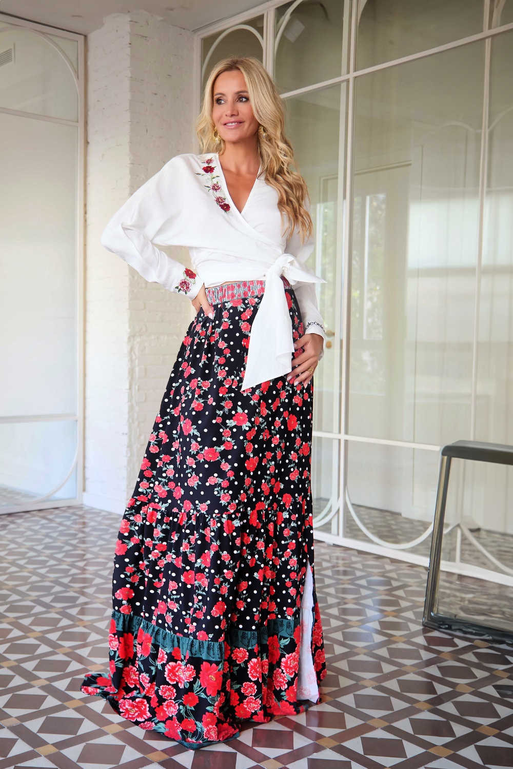 Falda larga de tiro alto azul con estampado de flores en tonos verdes, rosas, naranjas y turquesas, con abertura en un lateral. Los laterales llevan pasamanería bordada en azul. La cinturilla es elástica y multicolor. Se abrocha detrás de la cintura con cremallera dorada.