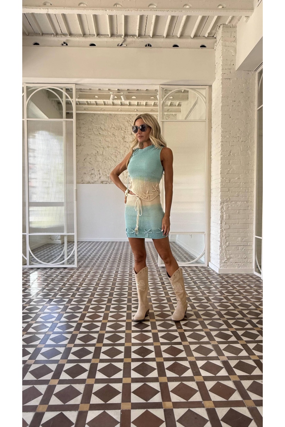 Falda corta, combinando los colores azul turquesa y beige con efecto tie-dye, en tejido de crochet y entallada. En la parte de la cintura lleva cordón para apretar, con detalle de cuentas en nácar y las alas doradas de la marca. En la parte de abajo de la falda lleva bordadas en crochet estrellas de mar en turquesa.
