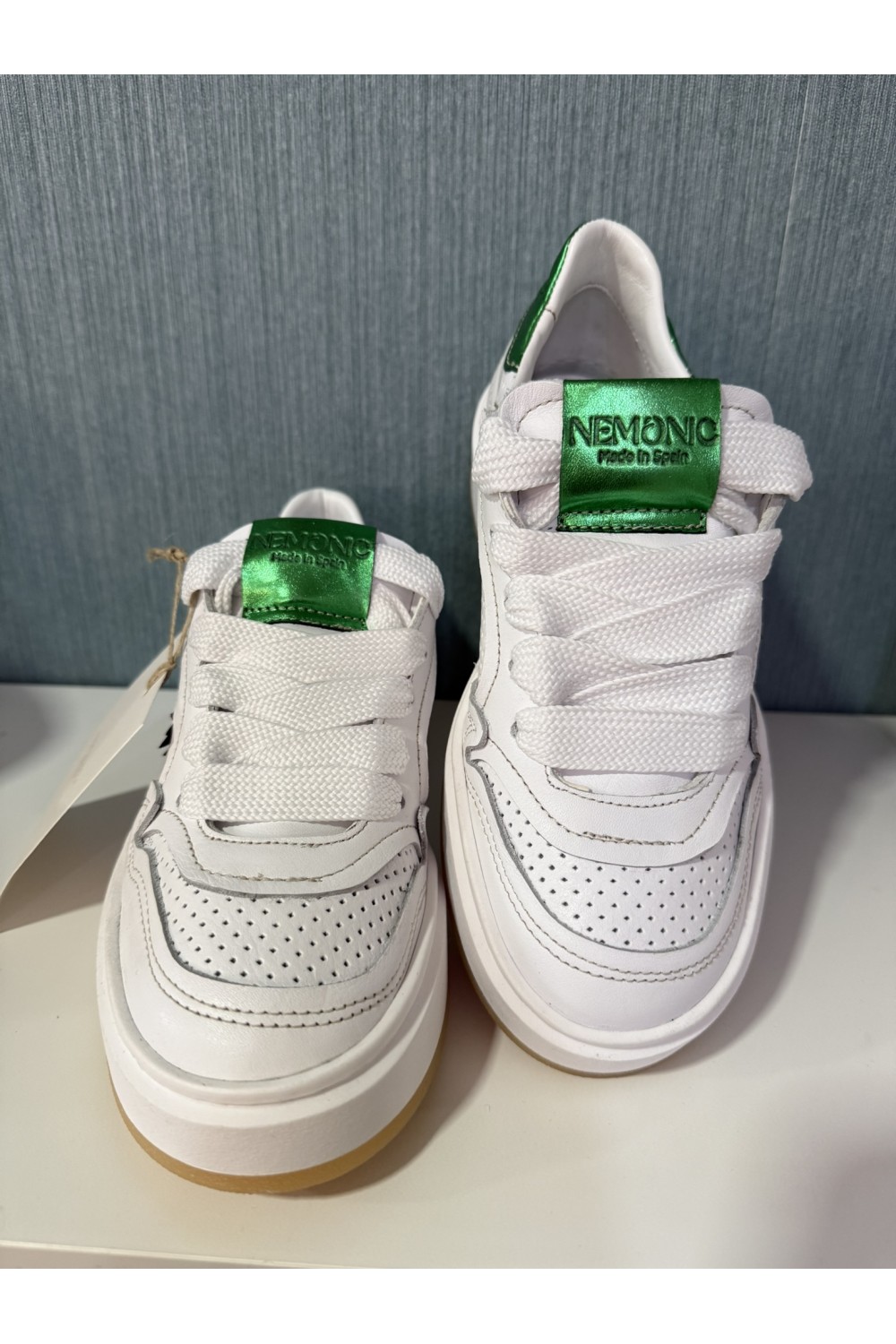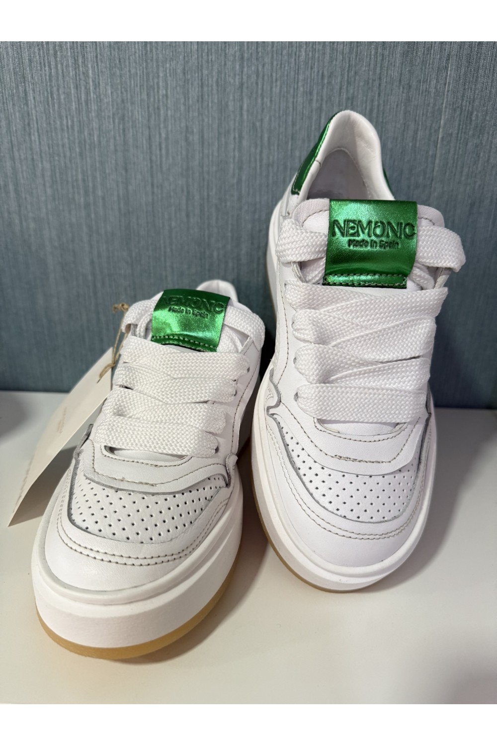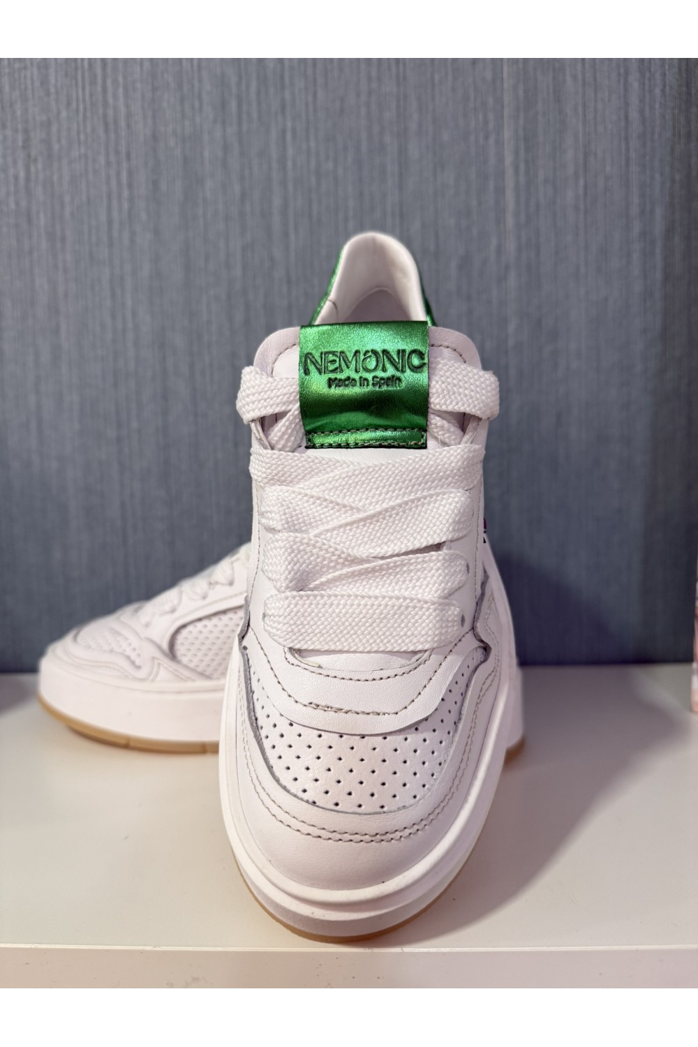 Deportiva en piel blanca troquelada con detalle rayo rosa y verde metalizado