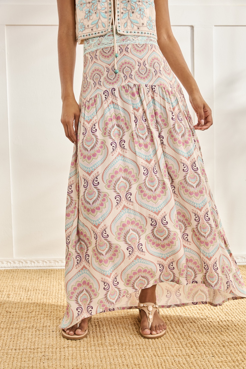 Falda larga 100% rayon con estampado paisley y cinturilla bordada