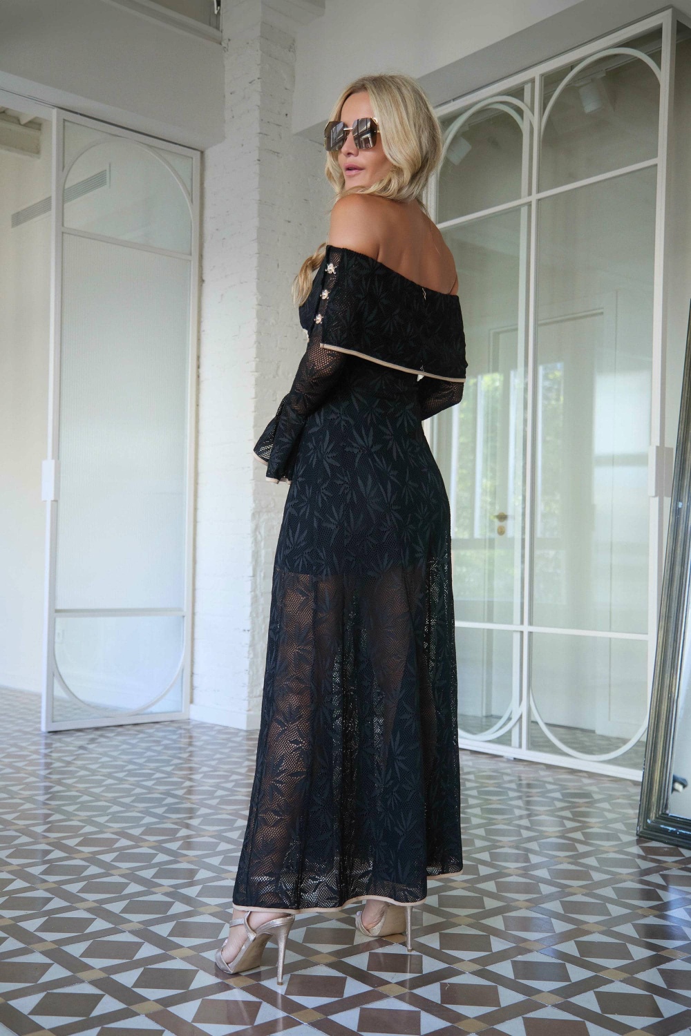 Vestido largo fluido negro de crochet con dibujo de flor, escote bardot elástico y manga larga farol. El escote y el puño de la manga vienen ribetados en marrón y en el lateral del hombro viene una abertura unida con detalle de soles dorados. El vestido tiene abertura lateral en una pierna. Incluye forro corto palabra de honor.