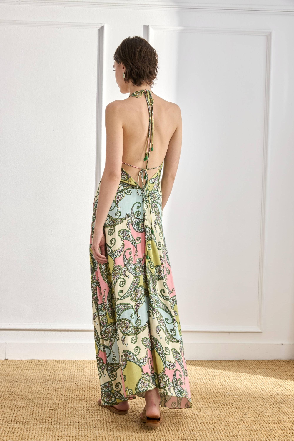 Vestido largo viscosa estampado paisley con cuello halter y escote bordado